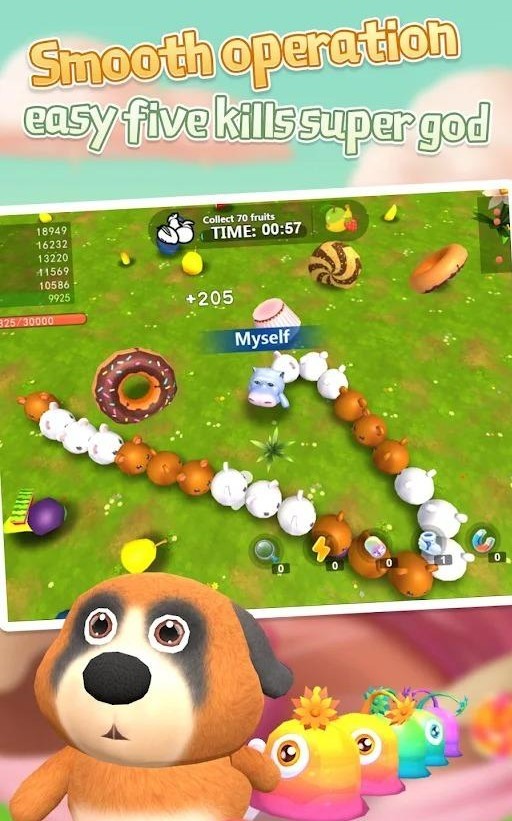 3、添加队伍的长度,诱惑对手撞到本人即可消灭对手,并取得他的一切水果,进步效率。