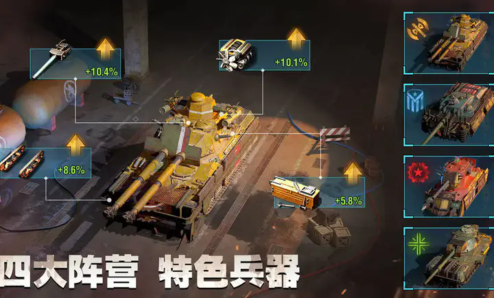 游戏中各类坦克是战斗的主要载体,我们共有4阵营、9种类共计24种不通的特色的战车、坦克。单位可通过升级、改造、装备军官、配件来提升战力。同阵营单位上阵可获得独属自己阵营的技能加持!
