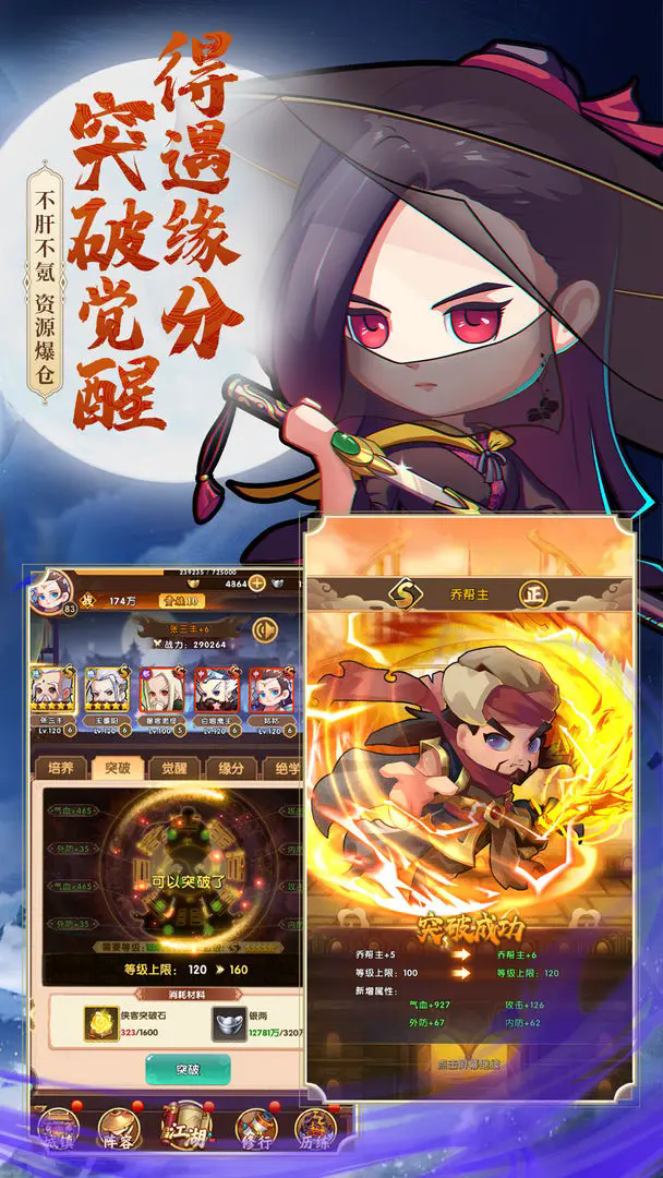 4、佛系放置无时无刻都在变强。你可以创建一支队伍,根据侠客属性随意搭配,挑战各路侠客精英。