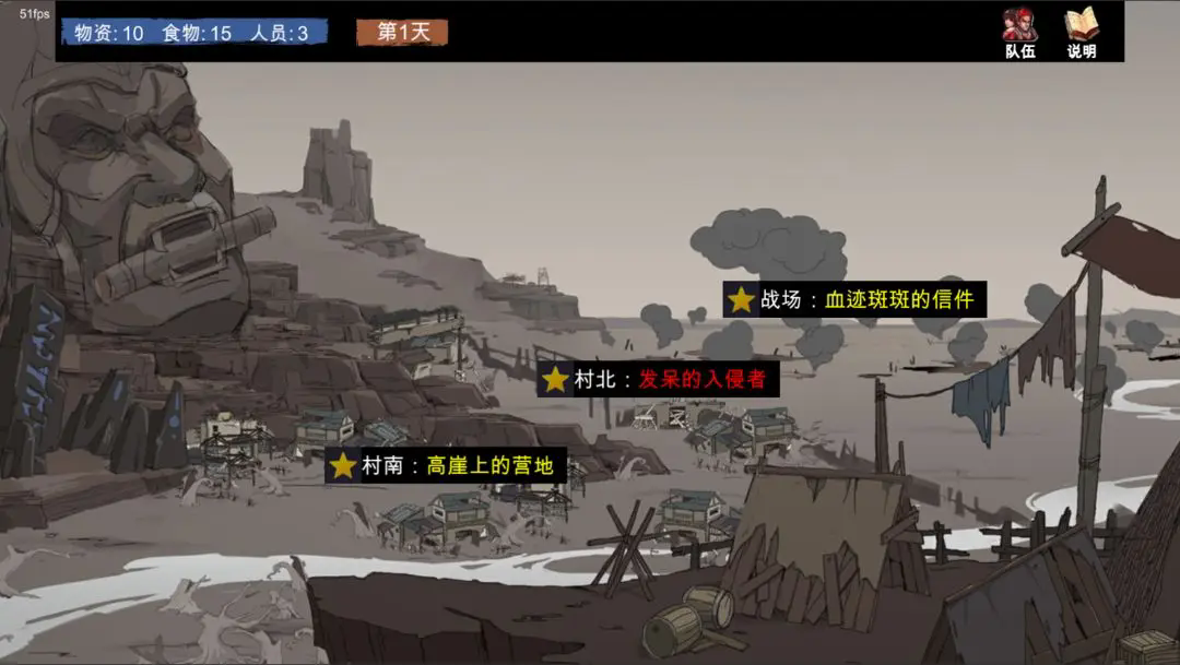 在游戏的开局你将能获得由一个刀客和一个渔夫以及一个算命先生所组成的队伍,玩家每一次战斗只能选择上场一个人,设计了凄惨的末世生存背景,玩家要在其中收集物资和食物并生存下来。
