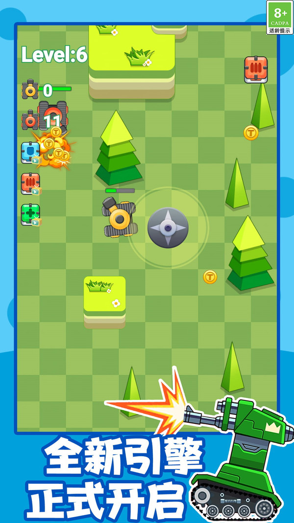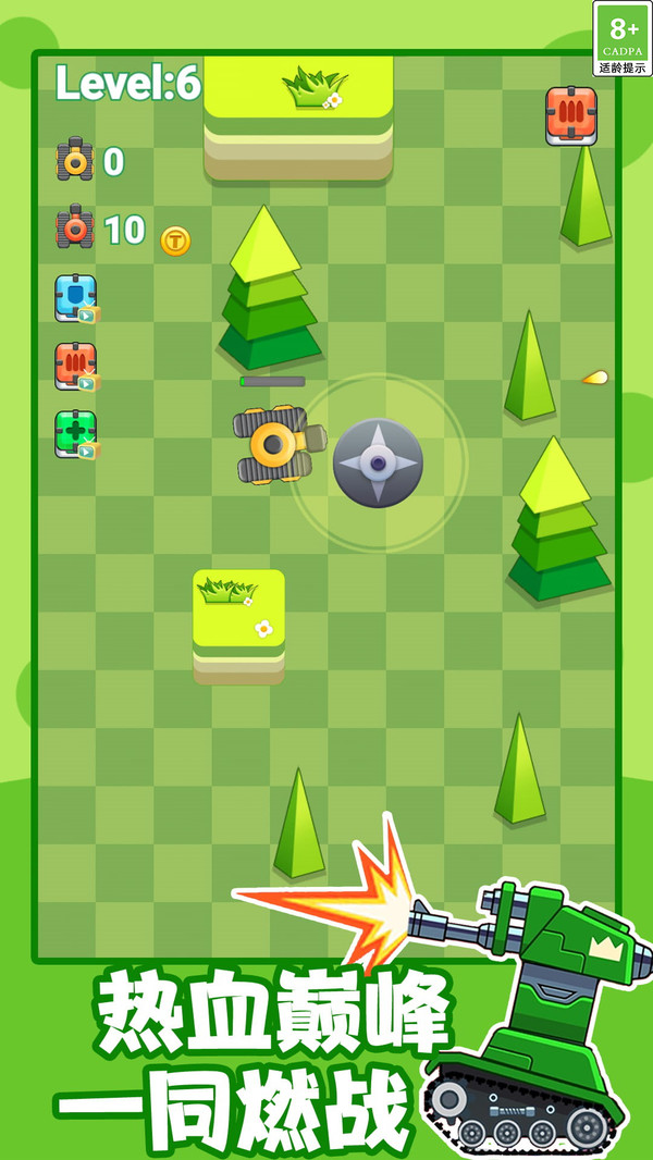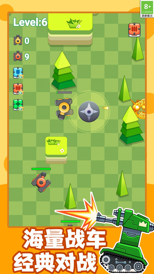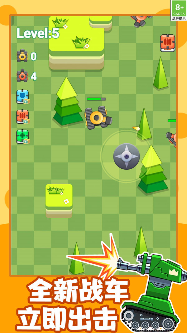 坦克吃鸡对战是一款很棒的载具射击类手游,将最具休闲氛围的模拟吃鸡玩法带给玩家,玩家需要在卡通地图上击败所有的敌人坦克,努力的升级你的坦克才能更加轻松的吃鸡!玩家在游戏世界开启全新的战斗和玩法,控制着你的坦克进行无限制的战斗,全方位的去参与到各种各样的战争之中!你遇到的坦克越来越强,在放置的环境之中击败你的敌人!