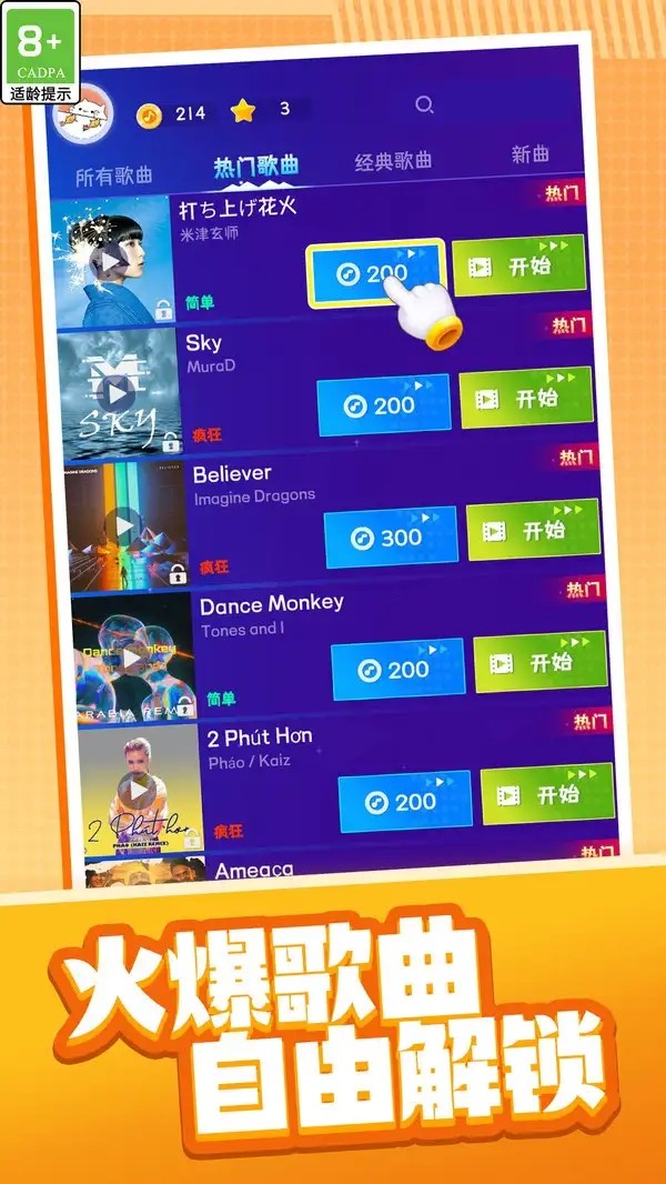 指尖跳动的音符游戏是一种跟随节奏点击的手指游戏,随着动感的旋律轻快地跳跃,准确地点击每一个落下的音符。从经典老歌到流行金曲,从悠扬的旋律到激情的动作,难度随着游戏的进行逐渐增加,满足各种玩家的音乐品味,挑战玩家的反应速度和节奏感。