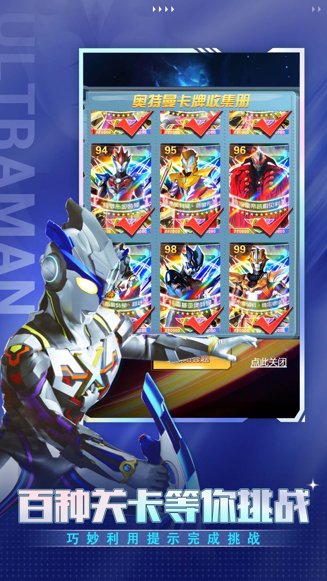 1.解锁奥特曼角色,收集具有挑战性的竞技游戏卡牌,完成游戏任务。
