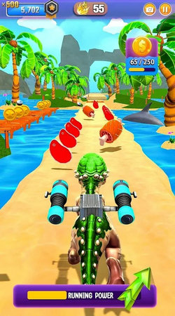2.在奔跑的过程中,玩家可以收集加速器、盾牌等各种道具来提高恐龙的跑酷能力。