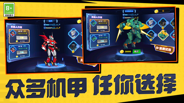 注意不断升级你的机器人,在各种战斗中去冒险,凭借自己的力量轻松获胜。