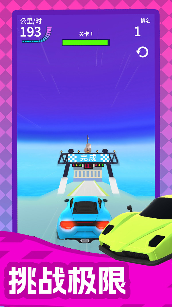 1.这是一款挑战控制极限的赛车游戏。快速控制方向,前进并到达终点。