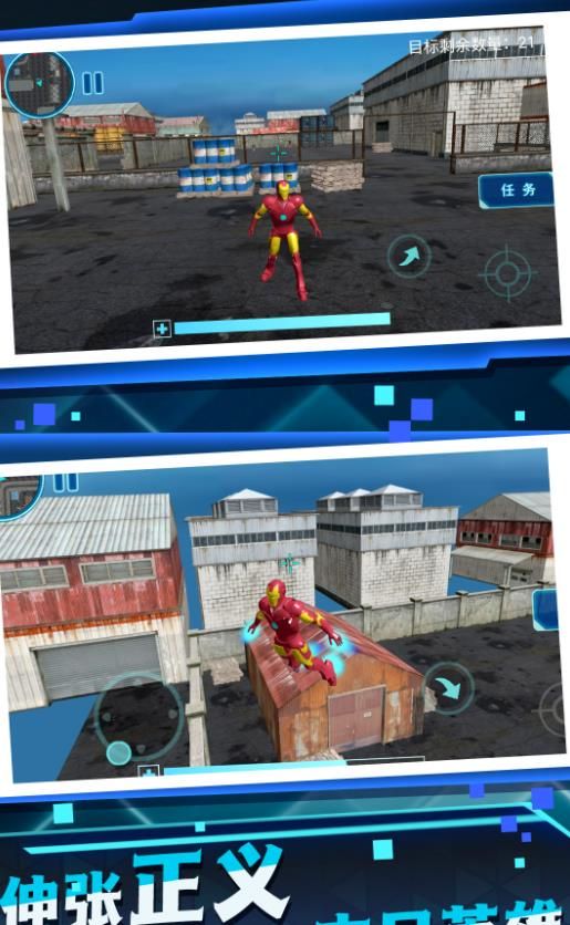 1、虚拟摇杆控制移动,点击技能键释放机甲专属攻击,滑动屏幕切换视角。