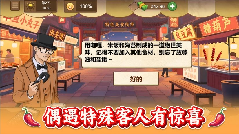 3、通过经营获取收益,升级店铺,解锁更多美食和食材随你的搭配。
