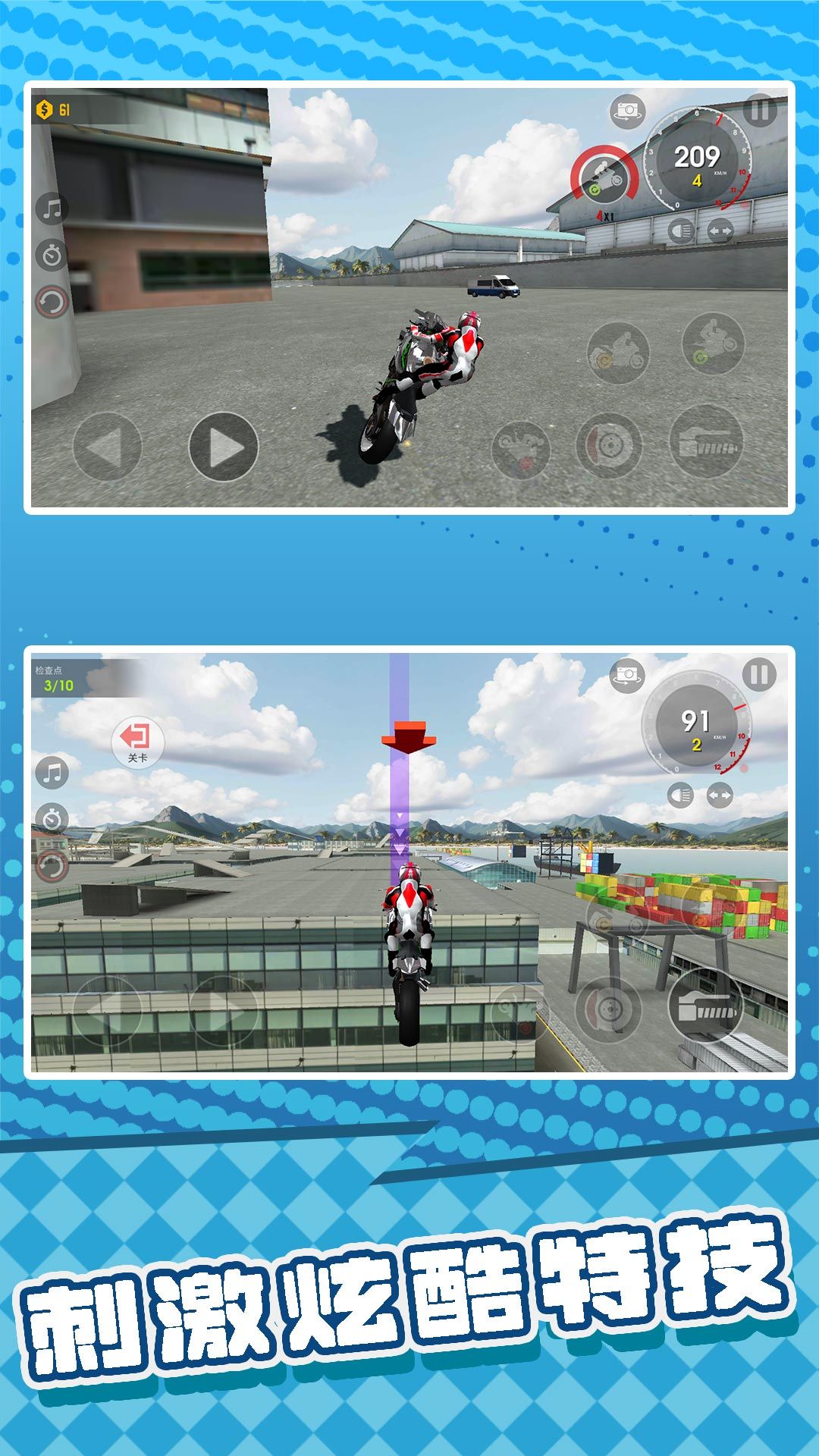 1、以摩托赛车手视角打造极速驾驶体验,涵盖直道冲刺、弯道漂移等核心操作。