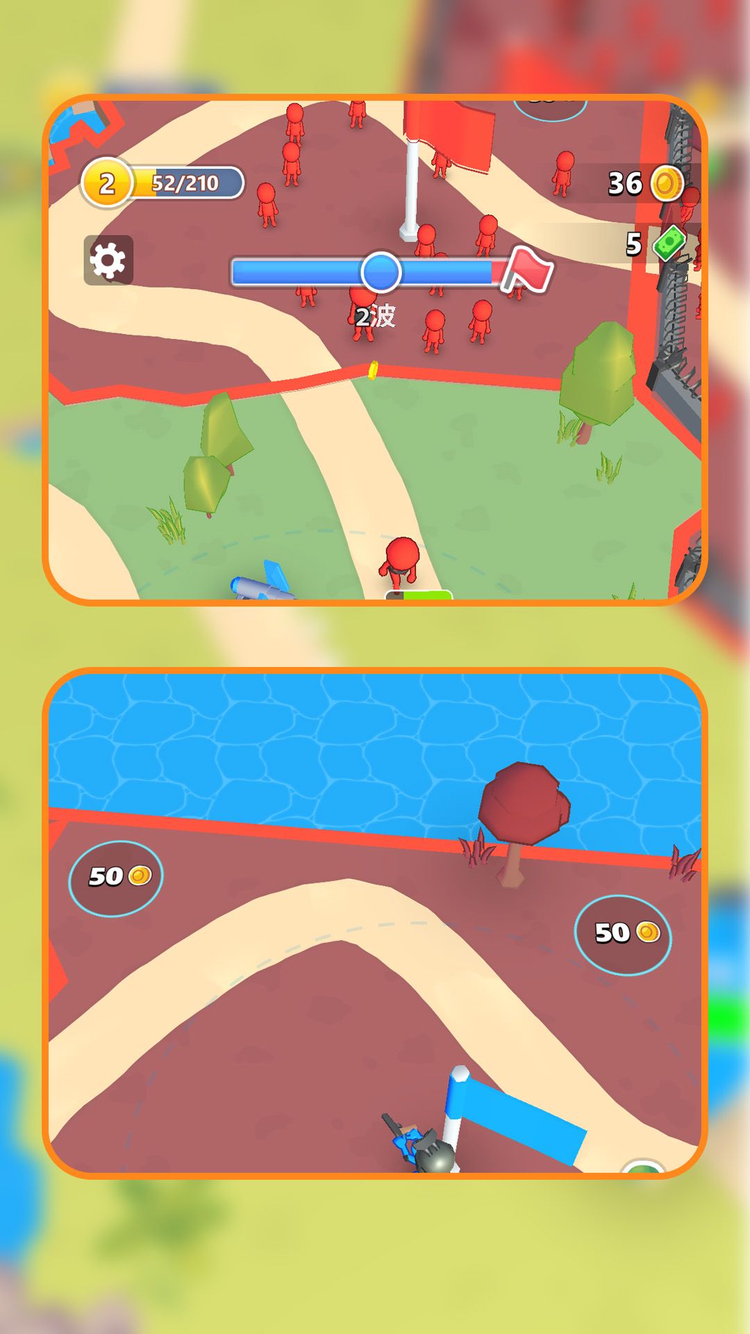 1、扮演指挥官,站在关键区域,指挥小兵作战,升级武器装备,强化基地设施。