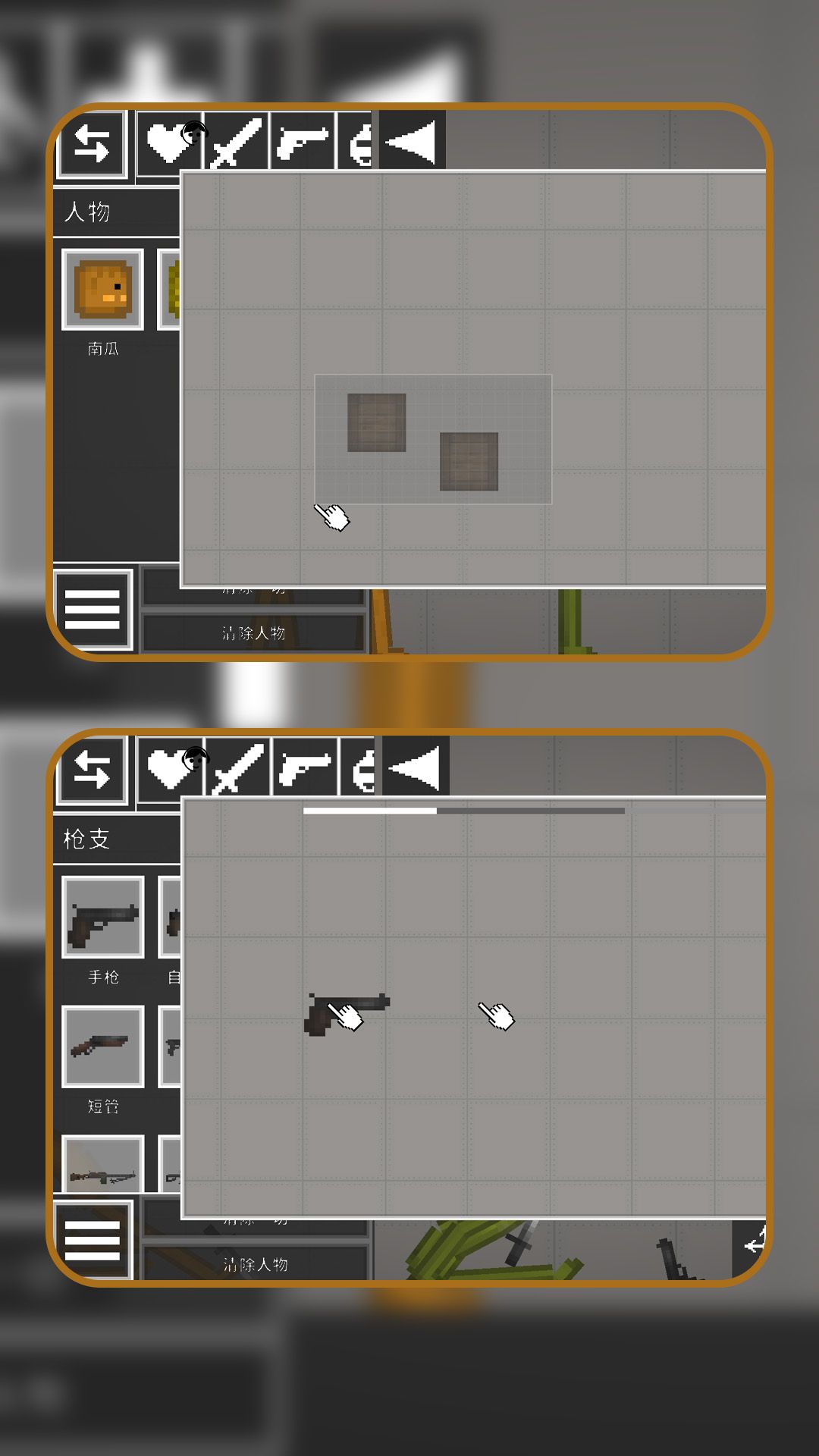 1、从物品栏拖入物品或角色到场景中,创建想象中的玩法,进行冒险和模拟。