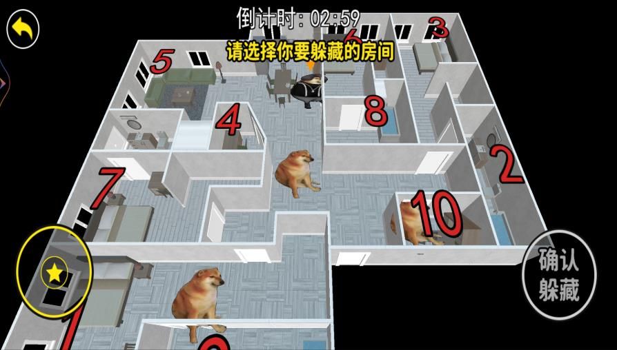 1、在规定的多个房间中选择一个作为进入的躲藏区域。