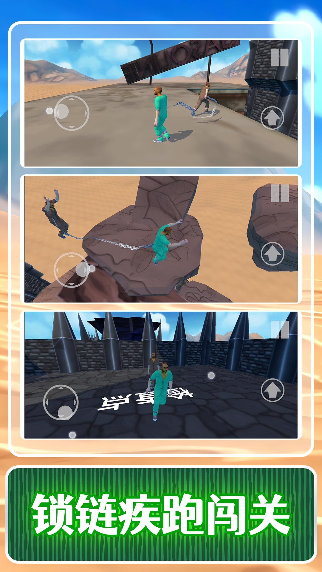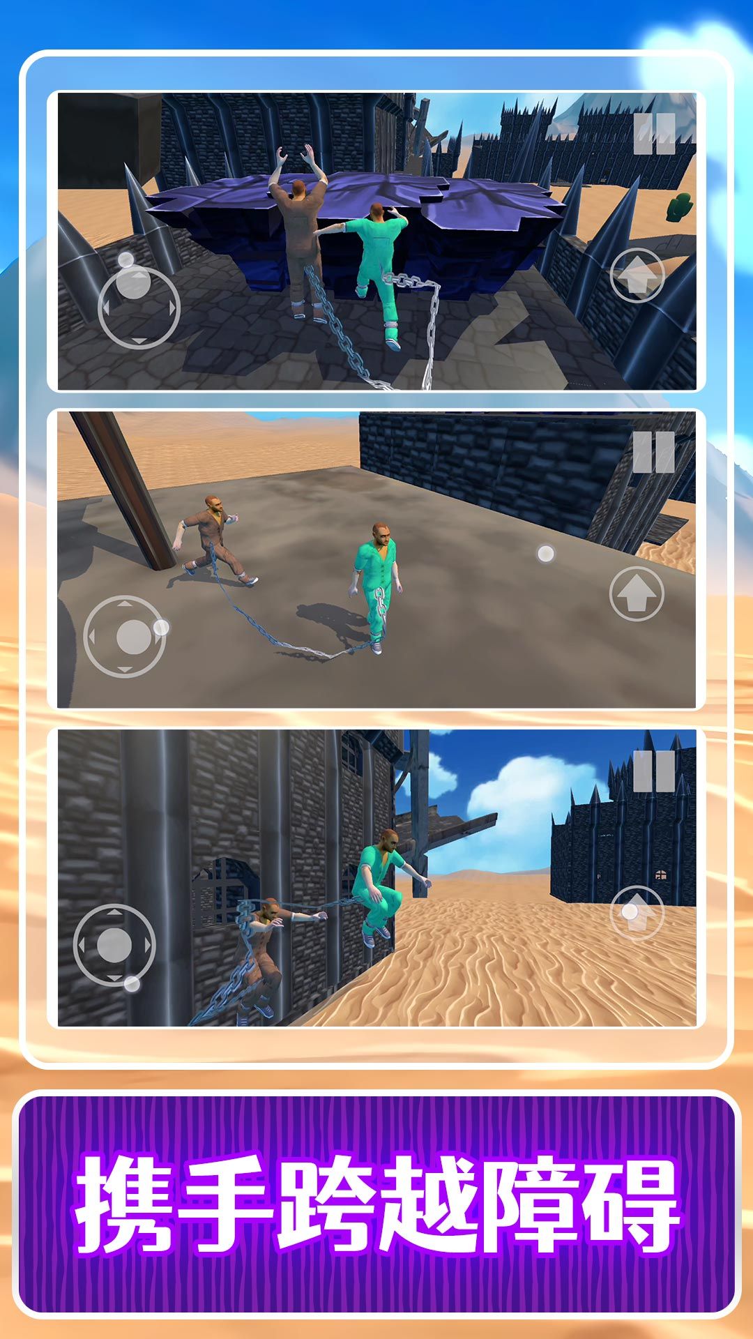 1、操控两个被锁链拴在一起的角色进行游戏,需要双人密切配合,很有挑战性。