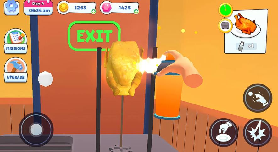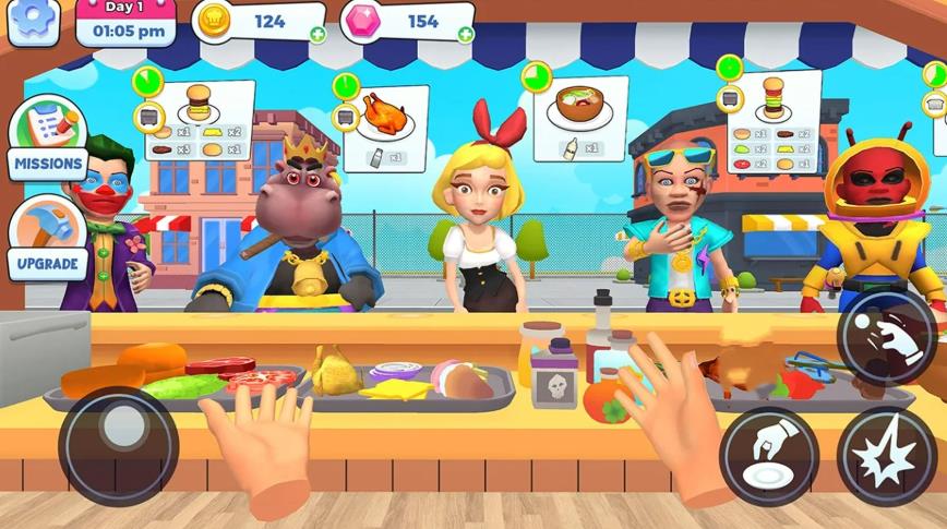 1、扮演一位个性鲜明的餐厅老板,在一个充满无厘头剧情的世界中努力发展。