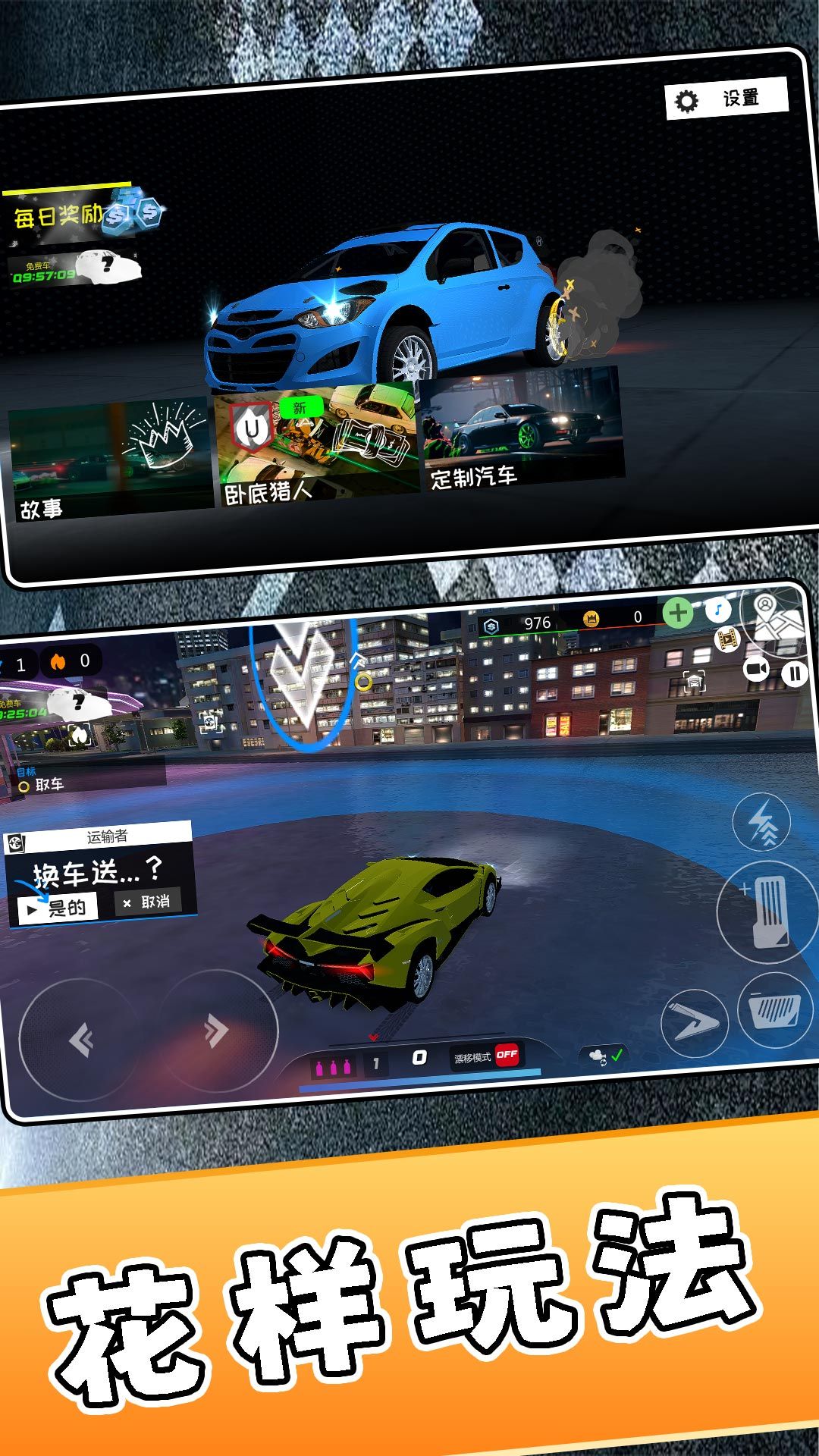 2、操作控制赛车行驶,利用漂移技巧过弯,以最快速度冲过终点线赢得比赛。