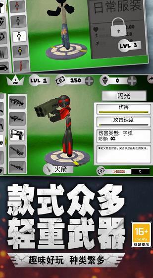 1、以经典火柴人形象呈现,搭配丰富多样的皮肤与装备,展现不同的风采。