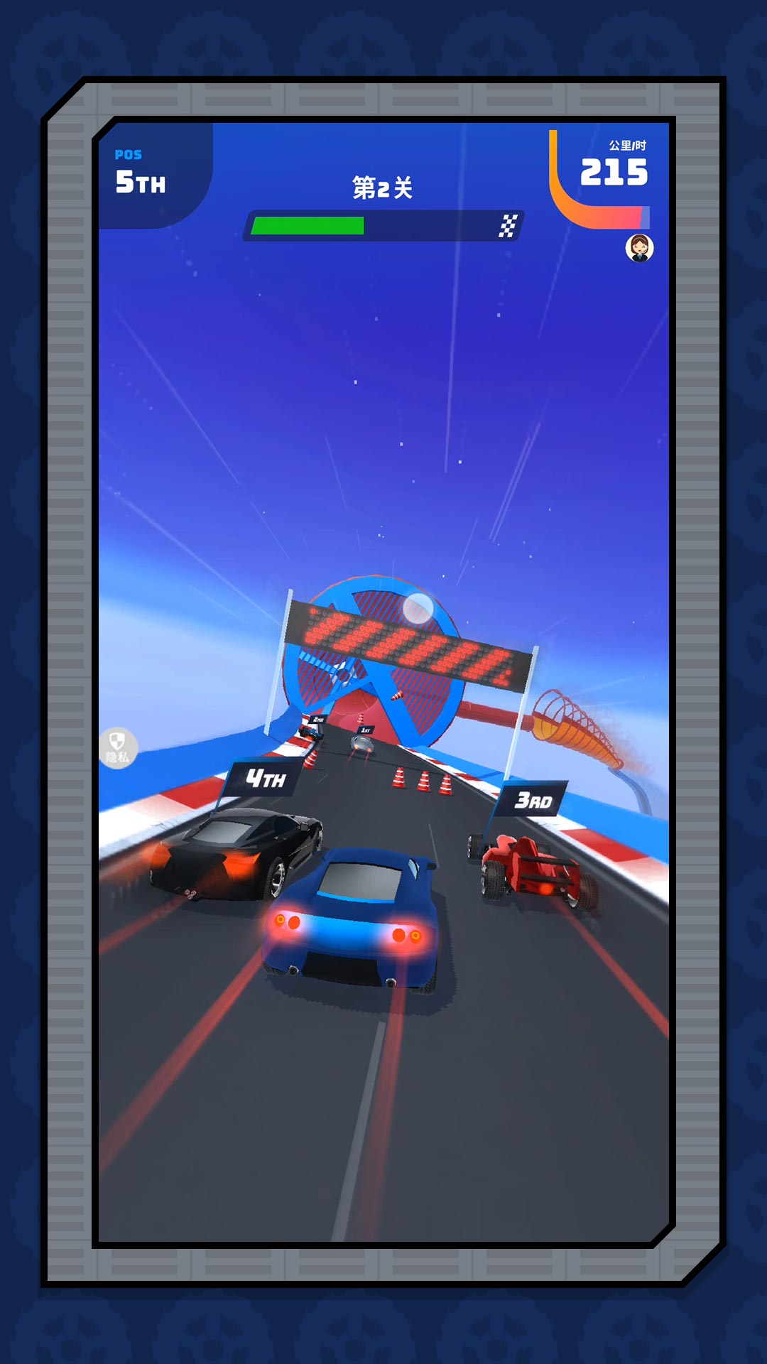 1、滑动屏幕左右移动车辆,控制它在各种赛道当中狂飙,朝着终点进发。