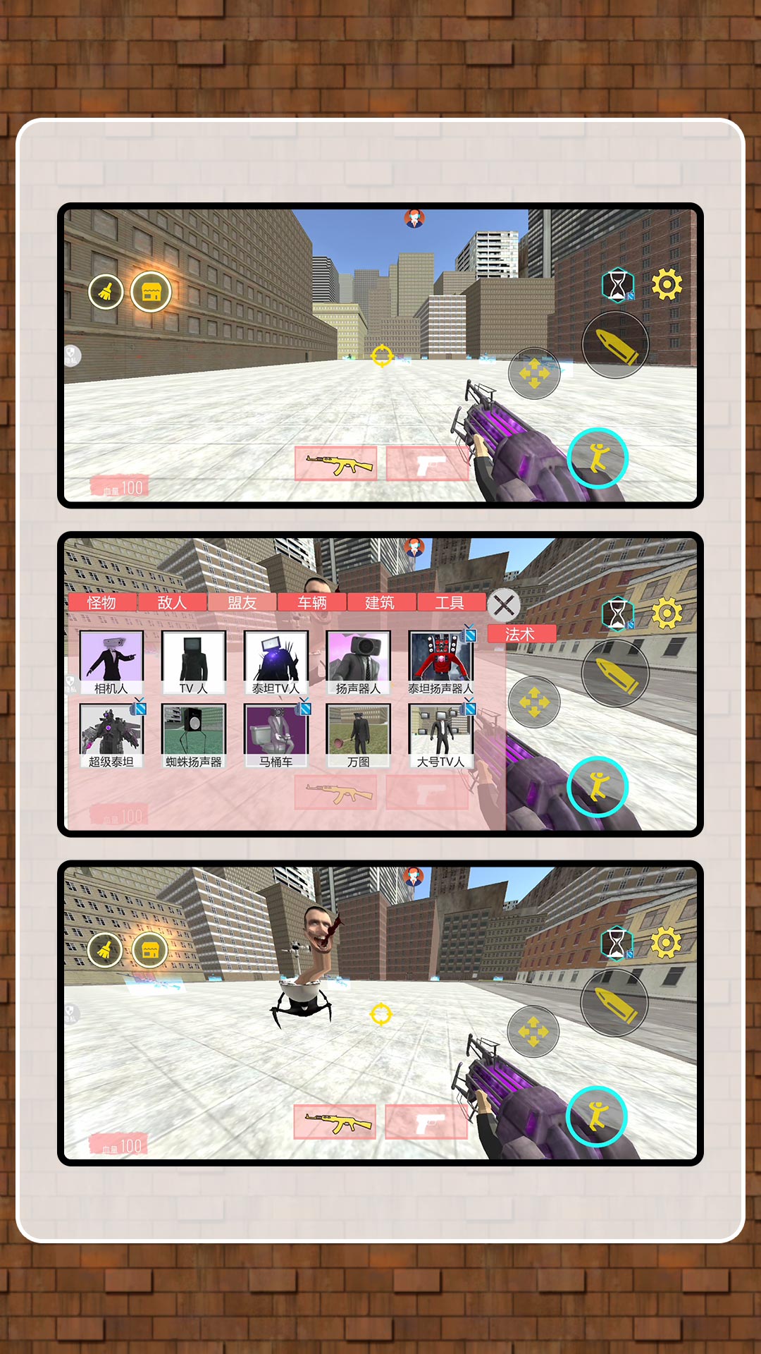 马桶人对决乱斗是一款射击冒险类游戏,玩家将在沙盒世界中展开探险,与各种危险的怪物进行战斗,并保卫自己的基地,防止其进一步入侵。游戏提供了多种武器供玩家自主选择,玩家需凭借精准的射击技巧,清除前进道路上的障碍。在持续的冒险过程中,玩家将面临诸多恐怖的挑战,这需要他们拥有足够的勇气,才能最终取得胜利。