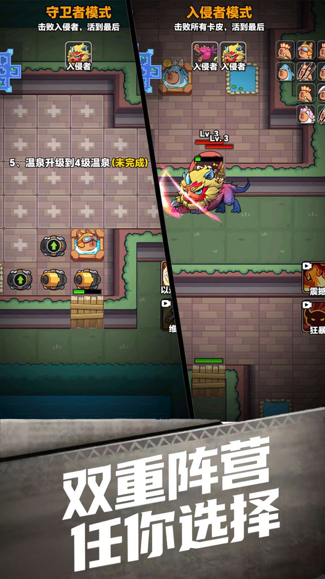 1、设双重阵营模式,玩家可选择守卫者抵御入侵或入侵者击败对手,阵营切换带来不同玩法体验。