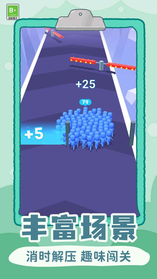 1、操控冲关小人在关卡中持续前进,通过灵活操作如左右滑动、跳跃躲避道路上的各类障碍。