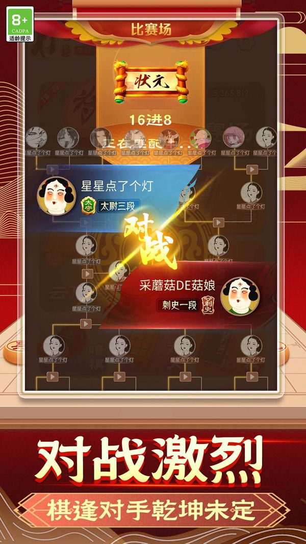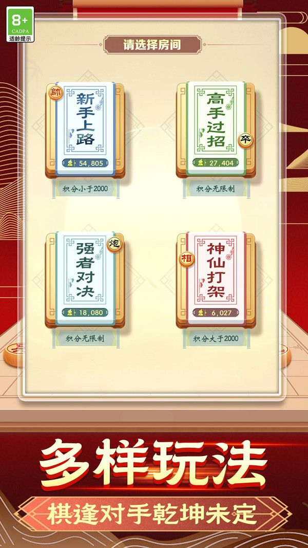 1、以象棋为核心构建多元对战场景,按积分划分不同房间,新手与高手各有专属对战空间,满足不同水平玩家的对战需求。