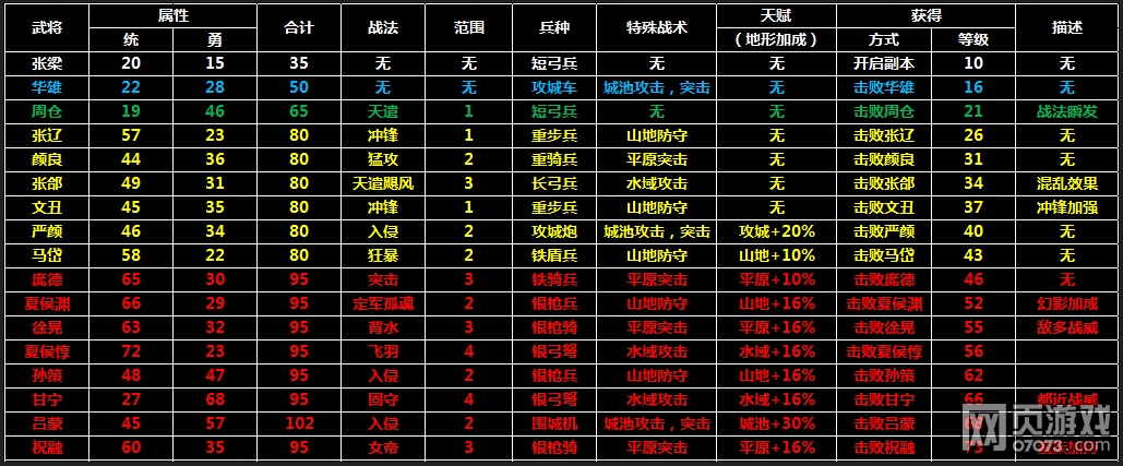 攻城掠地又出了一个新武将,下面就给大家整理出所有武将的属性,希望能给大家带来个参考.