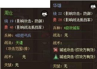 在这里的时候你就注意了,因为华雄是攻城将,他所带的兵种颜色比周仓带的兵种颜色高一个等级,
