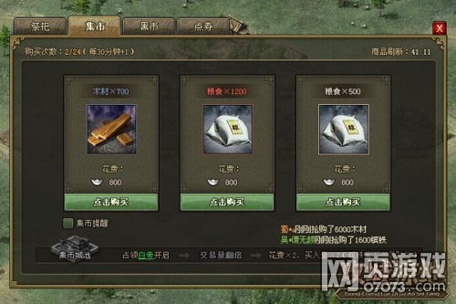 在大黑《攻城掠地》中,集市以盛产各种资源而广受玩家的喜爱。在集市中,系统会每隔1小时便重新刷新商品,其中包括粮食、镔铁、木材等资源,玩家可以通过花费一定的银两在集市中购买木材。玩家每天只能获得24次购买商品次数。