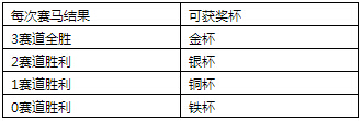 活动内容:活动期间,按照每次赛马的结果,可以获得不同的奖杯奖励(即不同数量的宝石奖励)。