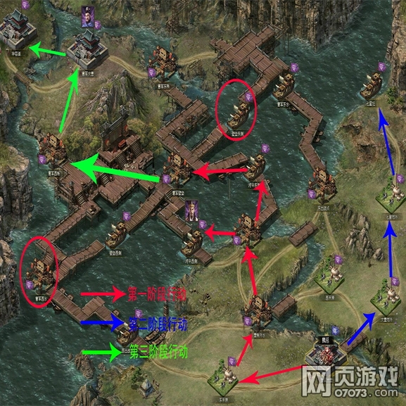 绿色路线所示,完成与黄盖对话,发动火烧赤壁剧情,攻占曹军大营,攻占华容;
