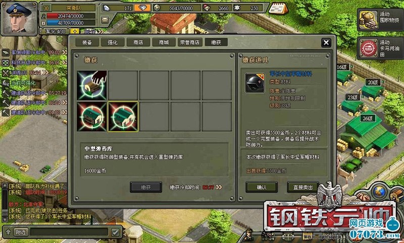 为了让大家体验到更多缴获乐趣,《钢铁元帅》创新设计出基地缴获的玩法,玩家只要把军事基地提升到指定等级,即可开启商店内“缴获”的功能。不需要承担任何的损失,只要进入基地建筑“商店”,通过特设的缴获功能,直闯敌方军火库和丹药库,展开各种“淘宝”行动。玩家每一次缴获都不会空手而归,绿色装备是最基本的斩获,一旦你的人品适时爆发,那么蓝色、紫色甚至黄色装备也是不在话下,相信基地缴获玩法一定能带给你超乎相信的惊喜!