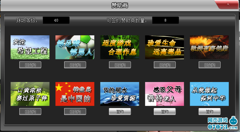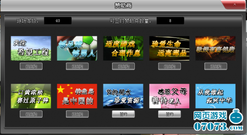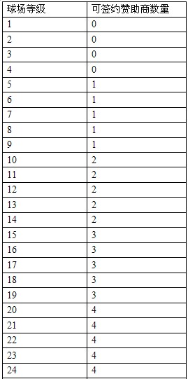 球队赞助商个数与球场的等级挂钩,最多10个。每升1级球场等级赞助商多一个。