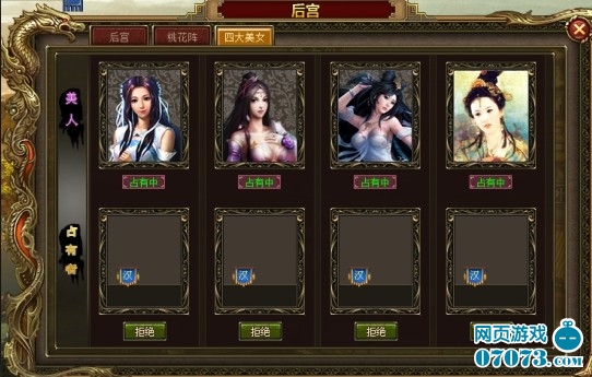 点击后宫中的四大美女界面,会显示现有四大美女的占有者,玩家可以通过PVP方式抢夺。