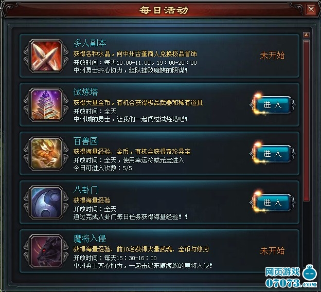 A6:悍将传世每天都有丰富的活动,包括:【多人副本】,【竹林夺宝】,【魔将入侵】,【生存挑战赛】等等玩家可通过点击“每日活动”按钮,参与活动!