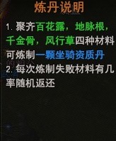 炼制: 通过百花露*1、地脉根*1、千金骨*1、风行草*1可以进行一次资质丹的炼制。