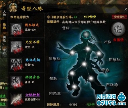 经脉在横扫天下武侠世界中,占有很重要的地位。结合了医学穴位,根据不同经脉加成不同的人物属性数值。经脉等级越高,属性加成越高,你只有在打通八条经脉后,才可让武功和属性更上一层,成为一代宗师。