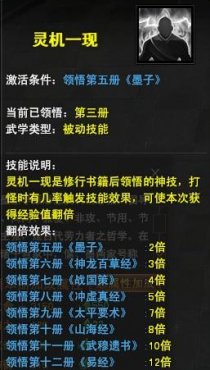 修行共分为12册:道德经、扁鹊心书、奇门遁甲、金刚经、墨子、神农本草经、战国策、冲虚真经、太平要术、山海经、武穆遗书、易经。从领悟第五册《墨子》开始打怪是会有几率触发“灵机一现”技能,该技能可获得经验翻倍的效果哦!随着修炼级别越高,经验翻倍倍数随之增加。