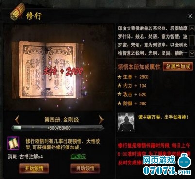 玩家可使用“古书注解”提升修行领悟。在修行领悟过程中,有几率出现顿悟、大悟效果,可获得额外修行值加成!每成功领悟一册,可提升大量战力!建议玩家尝试哦~