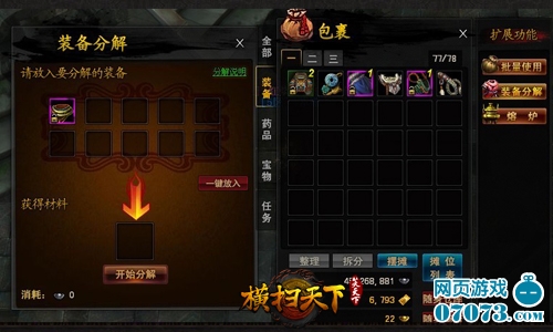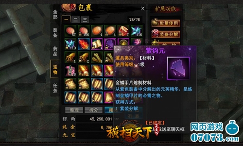 横扫天下新版本中增加熔炉系统,通过该系统分解紫色装备获得“紫均元”等材料,实现“宝甲御神”功能。将多余紫装转化为更强宝甲,实现游戏各系统的良性循环!