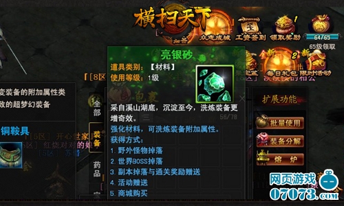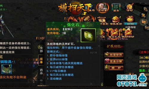 俗话说的好,巧妇难为无米之炊。想打造至尊神器,你要有必备材料才行。大自然中,平凡的砂砾顽石一经岁月的沉淀、揽日月之精华,也可磨砺成为奇珍异宝。强化石乃未经淬炼的天然矿石,是装备强化必备之物。玩家可通过在线抽奖、挖藏宝图、彩戏绣包等活动获得,35级的大破联营副本,野外打怪,每日威望,每日风云人物等均可获得强化石。
