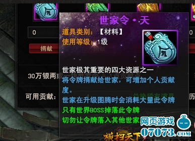 增加世家贡献的核心资源是“天地玄黄”四大世家令牌,该物品不仅会提高成员的贡献值,而且当世家升级图腾、技能以及开启押镖时,都可以用作消耗品。该物品只能通过击杀世界BOSS来获取,所以,各位大侠当积极征战世界BOSS,尽量多地收集令牌,从而壮大自身实力。