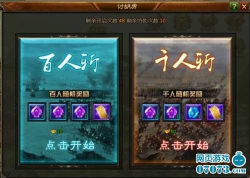 点击主界面上方“讨胡虏”活动图标即可进入讨胡虏主界面。讨胡虏分为百人斩和千人斩两种房间!