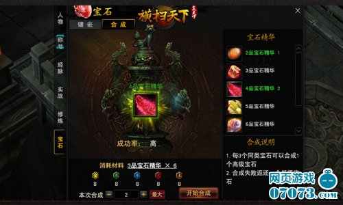 宝石有品级之分,每级形态各有不同,使用3个相同宝石就有几率合成一个高级宝石,若不幸失败,系统将返还1个低级宝石。当某一部位所嵌宝石精华总品级达到25级,可以激活1级宝石精魄加成,总品级达到35级,可以激活2级宝石精魄。