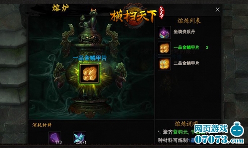 为宝甲镶嵌金鳞甲片,可以增加宝甲额外属性。现版本中,金鳞甲片已扩充至三个品级,由紫均元和相应的稀有材料合成,紫均元则是通过分解紫装而来。开放“临、兵、斗、者”四个槽位,备足指定材料,按顺序逐一激活各个槽位,可提升“攻击、防御、生命、身法”四大基础属性。