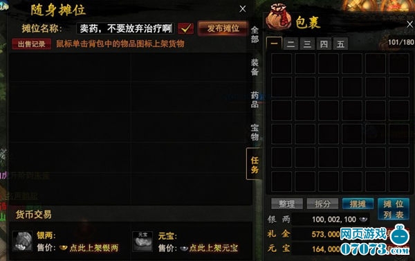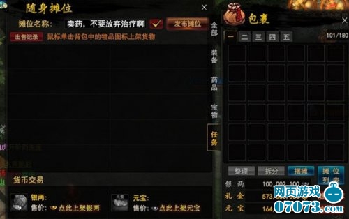 大家买的东西都一样,怎么才能有特色呢?横扫天下里面物品分为四大类,分别为装备、药品、宝物、任务,如果玩家每次售卖的时候都标明类别特色,那么缺少此类别的玩家必定会进!谁会舍得愿意浪费那么多时间去一一浏览筛选呢?