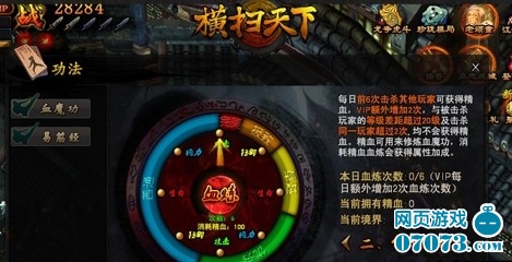 横扫天下里凡是修炼血魔功者,凭特殊法术,以凶兵取濒死之人体中精血元气,然后凝练成为“斩魂精魄丹”。“血魔功”是近期更新的功法系统,通过吸取他人精血,提升自身属性,从而突破魔攻境界。