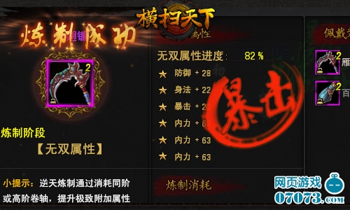 极致属性不再是完美属性,逆天炼制才是王道。只有传说中,无双的装备,才能匹配神威的你。暗黑武侠双端网游横扫天下装备逆天炼制,突破极限,完美变身,造就一把神威级的武器!