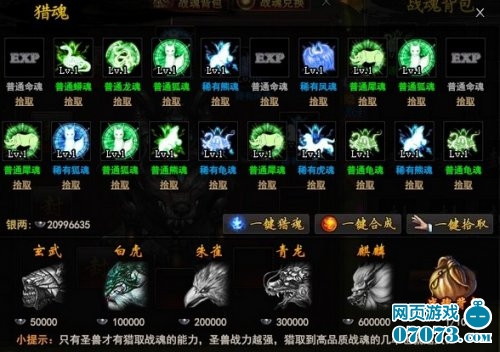 战魂背包中点击猎魂按钮进入猎魂界面,单击五圣兽可以获得战魂,五圣兽的等级越高,获得高级战魂的几率越大。