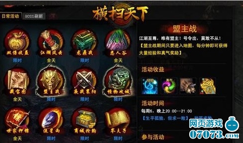 横扫天下盟主战玩法在每周六20:00-21:00开放,属于PVP玩法,加入世家的所有玩家都可以参与盟主战活动,胜者获得盟主令,将成为新一届武林盟主。盟主所属世家在活动中打怪的经验大幅提升,当然盟主本身得到的好处最大,盟主拥有大量属性附加,上线全服公告,跨场景公告,任免副盟主,所在世家经验加成等特殊对待。