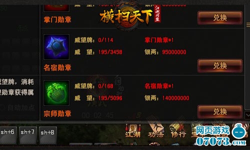玩家在人物界面可查看威望勋章具体信息,消耗威望牌、威望、银两兑换威望勋章,即可获得相应的属性加成。